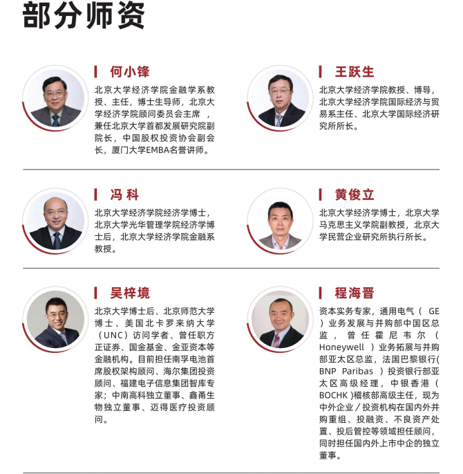 相关投资机构或中介机构专业人士;各产权交易所、拟参与改制并购的各类投资者。录取学员需签订北京大学社会招生非学历继续教育培训项目知情协议书。