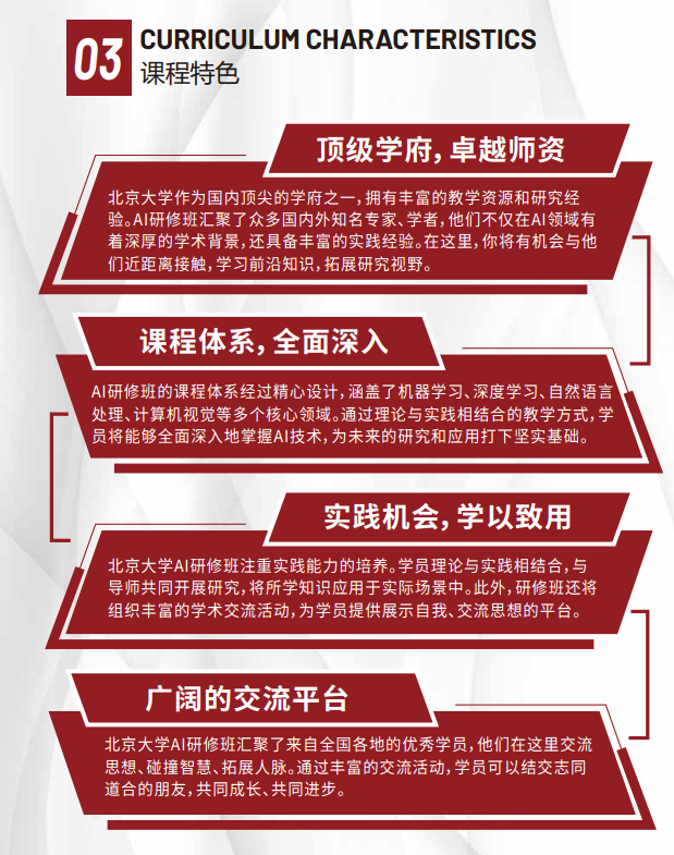 北京大学作为国内顶尖的学府之一,拥有丰富的教学资源和研究经验。AI 研修班汇聚了众多国内外知名专家、学者,他们不仅在 AI 领域有着深厚的学术背景,还具备丰富的实践经验。在这里,你将有机会与他们近距离接触,学习前沿知识,拓展研究视野。