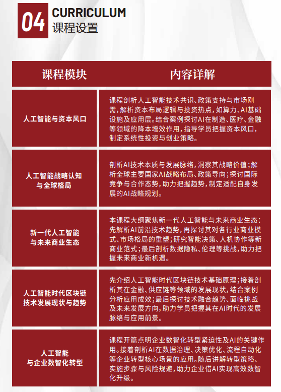 | 人工智能战略认知与全球格局 | 剖析 AI 技术本质与发展脉络,洞察其战略价值;解析全球主要国家 AI 战略布局、政策导向;探讨国际竞争与合作态势,助力把握趋势,制定适配自身发展的 AI 战略规划。 |