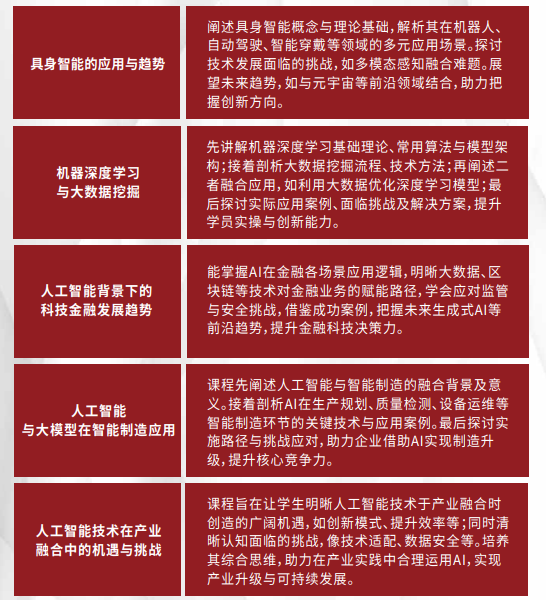 | 人工智能背景下的科技金融发展趋势 | 能掌握 AI 在金融各场景应用逻辑,明晰大数据、区块链等技术对金融业务的赋能路径,学会应对监管与安全挑战,借鉴成功案例,把握未来生成式 AI 等前沿趋势,提升金融科技决策力。 |