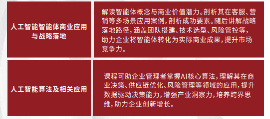 | 人工智能算法及相关应用 | 课程可助企业管理者掌握 AI 核心算法,理解其在商业决策、供应链优化、风险管理等领域的应用,提升数据驱动决策能力,增强产业洞察力,培养跨界思维,助力企业创新增长。 |