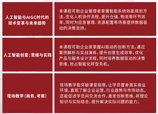 | 人工智能与 AIGC 时代的技术变革与未来趋势 | 本课程可助企业管理者掌握智能系统效能规划方法,优化人机协作流程,提升仓储、物流等环节效率,同时为应急管理、资源配置等场景提供数据驱动的决策支持。 |